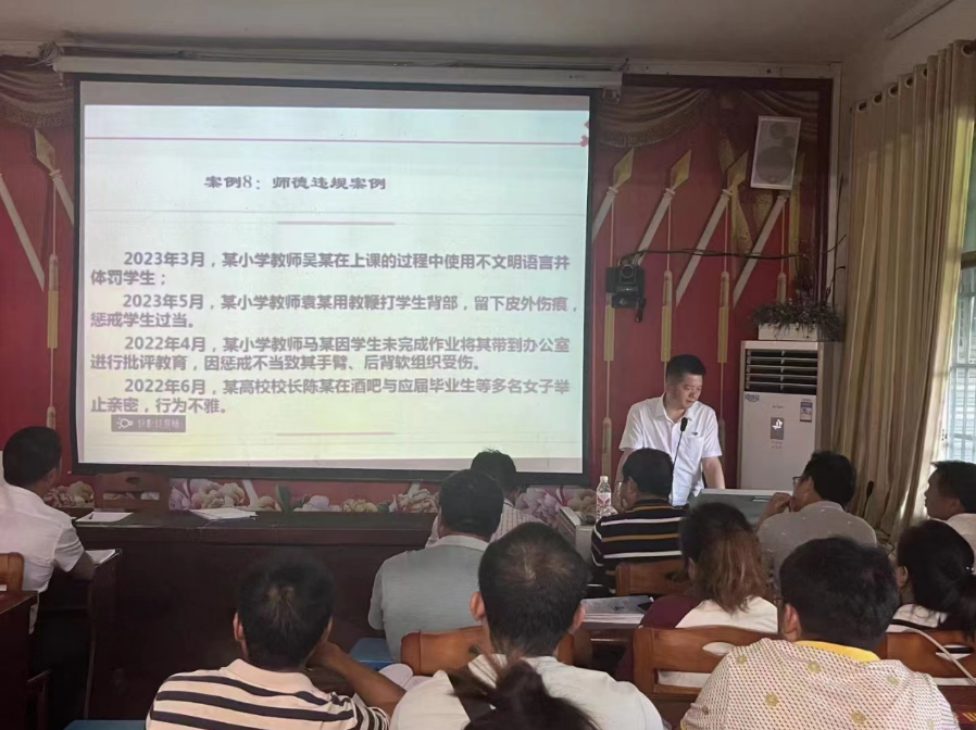為(wèi)引導各校(xiào)老(lǎo)師(shī)樹(shù)立依法治教的(de)觀念,增強法律意識,領會(huì)法律精神,2023年(nián)7月(yuè)16日(πrì),貴州文泰律師事務所支部書(shū)記、主任黃(huáng)桓律師(shī)到(dào)天柱縣第九小(xiǎo)學與藍(lán)田小 (xiǎo)學的(de)全體(tǐ)教師(shī)開(kāi)展法治公益宣講,主題為(wèi)《做(zuò)遵紀守法的(de)好(hǎo)老(lǎo)師(shī)》。