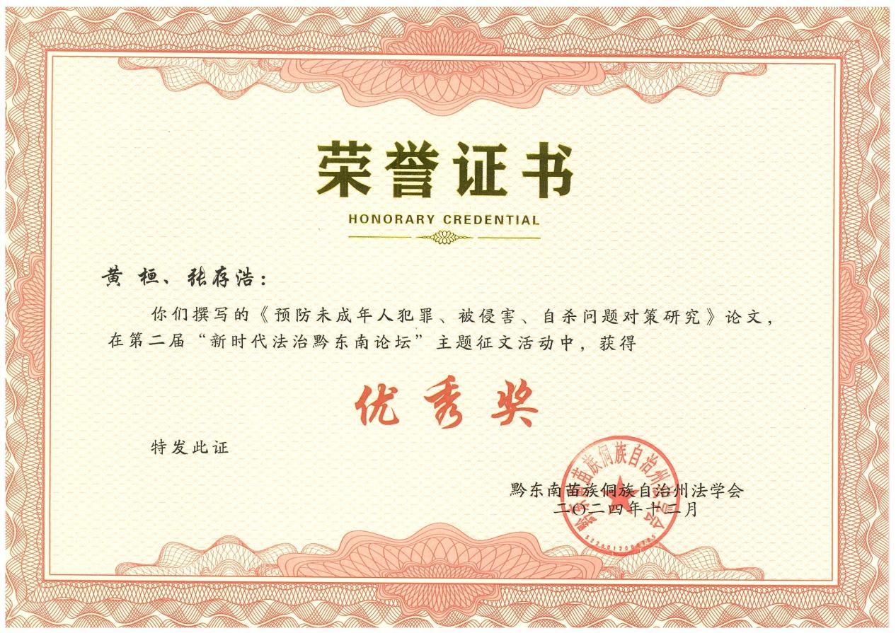 黃(huáng)桓、楊茂權、張存浩三位律師(shī)在第二屆“新時(shí)代法治黔東(dōng)南(nán)論壇”主題征文(wén)活動中分(fēn)"别榮獲“一(yī)等獎”和(hé)“優秀獎”
