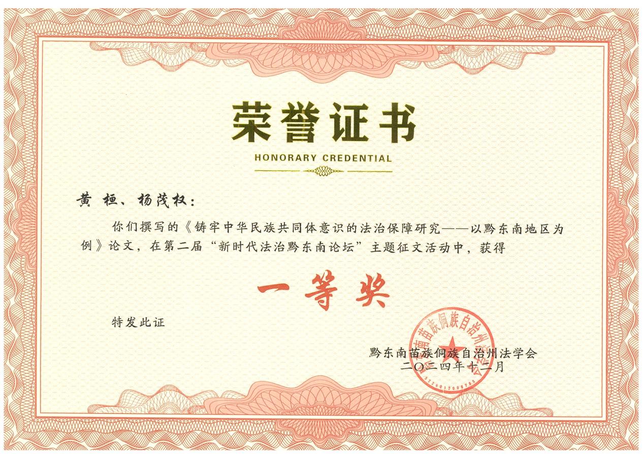 貴州文泰律師事務所黃(huáng)桓律師(shī)、楊茂權律師(shī)所撰寫的(de)論文(wén)《鑄牢中華民(mín)族共同體(tǐ)意識的(de)法治保障研究——以黔東(dōng)南(nán)地(dì)區(qū)為(wèi)例》榮獲“一(yī)等獎”;黃(huáng)桓律師(shī)、張存浩律師(shī)所撰寫的(de)論文(wén)《預防未成年(nián)人(rén)犯罪、被侵害、自(zì)殺問(wèn)題對(duì)策研究》榮獲“優秀獎”。這(zhè)是(shì)對(duì)他(tā)們在法治領域深入研究和(hé)貢獻的(de)高(gāo)度認可(kě),也(yě)是(shì)對'(duì)貴州文泰律師事務所團隊深入法治領域研究的(de)重要(yào)肯定,不(bù)僅提升了(le)個(gè)人(rén)榮譽,也(yě)提升了☆(le)律所的(de)聲譽。